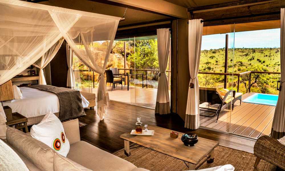Magnificent kopjes dominate the public areas, with superb views from the bar, sitting and dining areas, swimming pool and the decks. Guests may enjoy several dining options in camp or out in the bush with a choice of freshly cooked starters, main course, desserts and house drinks. Tea is served in the afternoon before your game drive and cocktails at sunset on one of the kopjes overlooking the Isuria escarpment.
