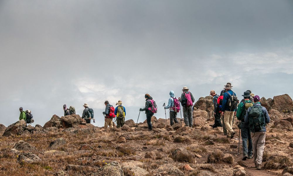 Once out of the forest, take a steep track into a Savannah of tall grasses, heather, and volcanic rock draped with lichen beards. Ascend through the lush rolling hills below the Shira plateau, finally reaching camp at the edge of the plateau. The view of Kibo from across the plateau is amazing.